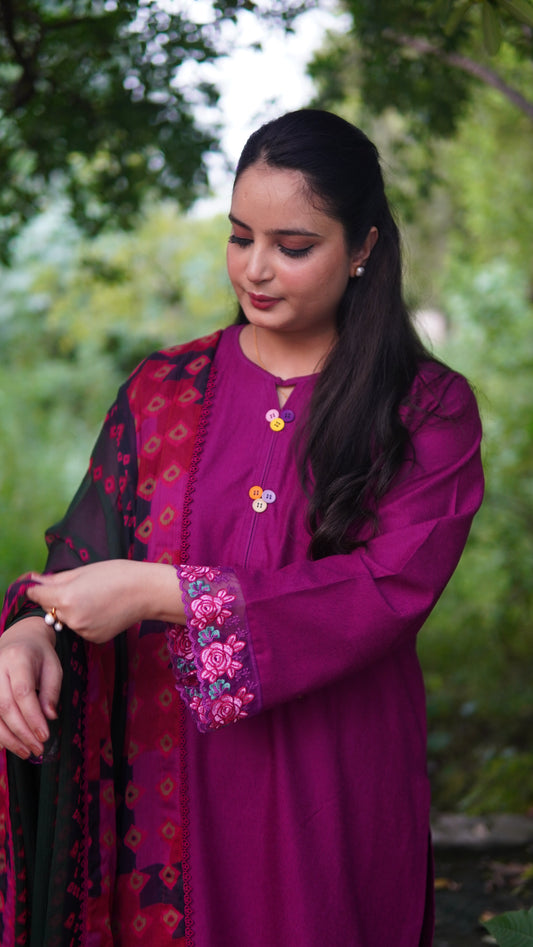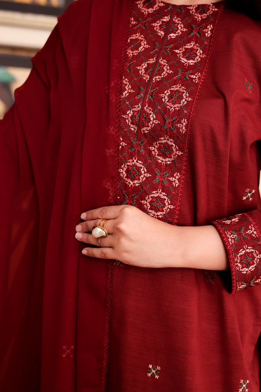 2-Piece Maroon Embroidered Khaddar Stitched Suit