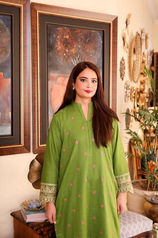 2-Piece Olive Green Embroidered Khaddar Stitched Suit