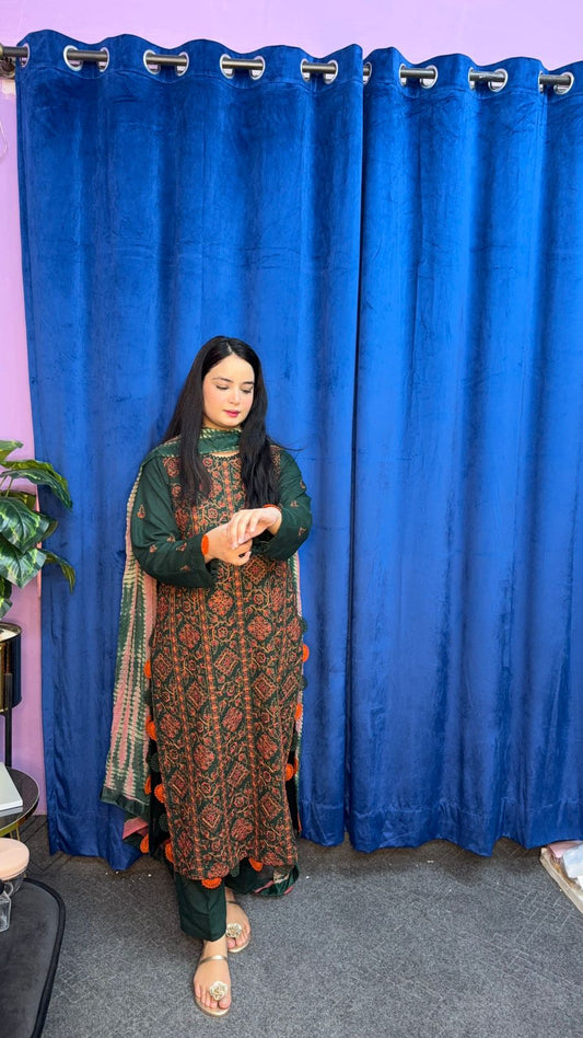 2-Piece Olive Green Embroidered Khaddar Stitched Suit