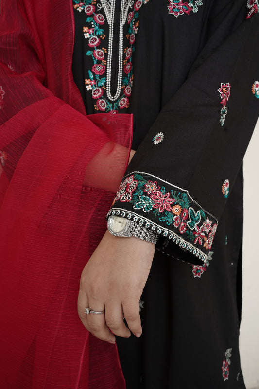 Luxury 3-Piece Black Suit – Multi-Color Embroidery & Khadi Net Dupatta