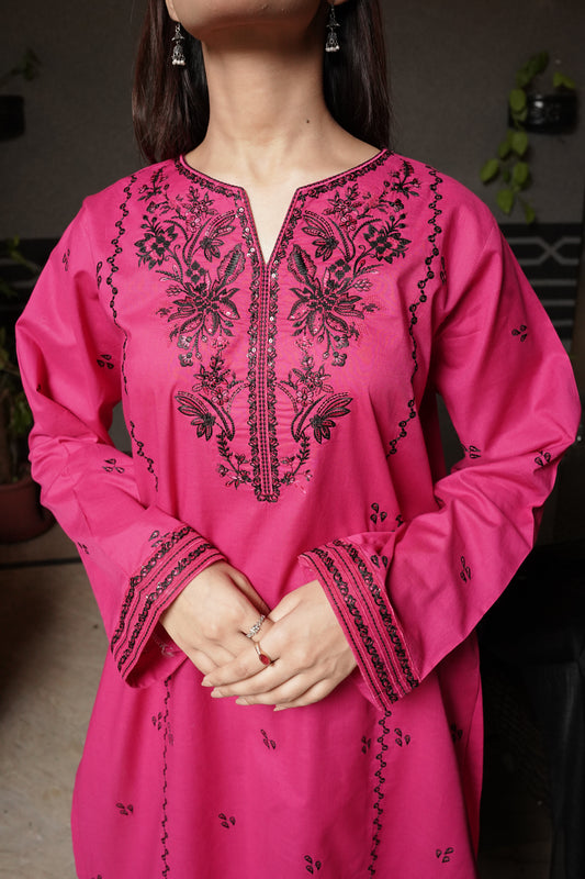 3-Piece Pink & Black Embroidered Suit with Thread Work & Khadi Net Dupatta