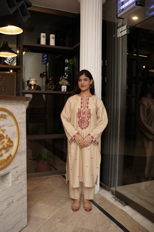 3-Piece Skin & Maroon Embroidered Suit with Sequin Detailing & Khadi Net Dupatta