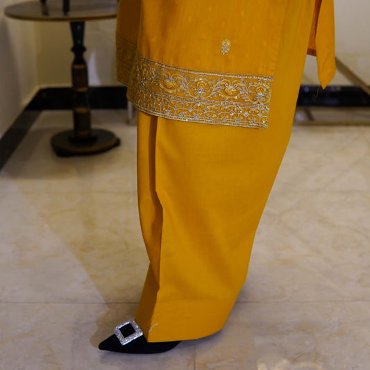 Yellow Two piece Embroidered Farshi Shalwar Design Stitched